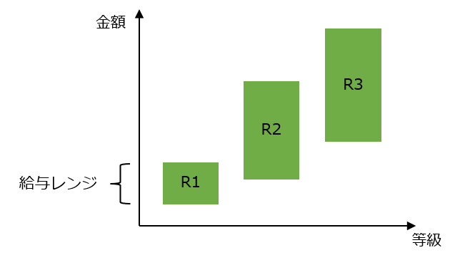 基本給がいくらの額になるかは、等級制度によって設定された等級毎の給与レンジ内で、各自の給与額を設定しています。以下の図を用いて説明すると、例えばR1とかR2という等級があって、それぞれの等級毎に、『基本給:下限〇円~上限〇円』と、レンジ(金額の範囲)が決まっています。採用時には、どの等級の役割を担うポジションかをベースに、皆さんのこれまでの経歴等を加味して基本給が決まるという具合です。