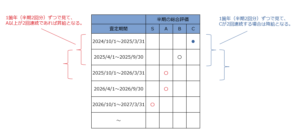 「2024/10/1~2025/3/31」の半期と「2025/4/1~2025/9/30」の半期の1箇年で見て、A以上(SまたはA)が2回連続あれば昇給となる。さらに「2025/4/1~2025/9/30」の半期と「2025/10/1~2026/3/31」の半期の1箇年で見て、A以上(SまたはA)が2回連続あれば昇給となる。といったように、半期ずつズラしていって1箇年を見ていきますので、最短で半年毎に昇給する可能性があるということです。