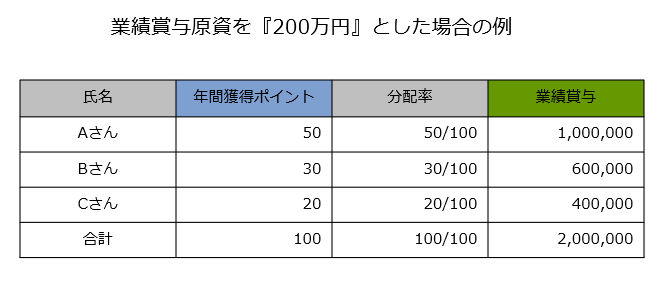 AさんとBさん、Cさんの3名分の総獲得ポイントから個人への分配率をはじき出し、業績賞与原資を案分すると。ざっくりとした簡易説明ではありますが、なんとなくのイメージはつかんでいただけたでしょうか?