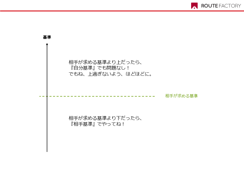 自分基準が、相手が求めている基準より低い場合は、「相手基準で仕事をしてください」となります。だって、相手が求めている基準より低いんだったら、相手からOKが出ないし、相手は満足しないですね。それに、自分の中だけの基準でOKを出していたり、満足している場合は、単なる自己満足ですから。