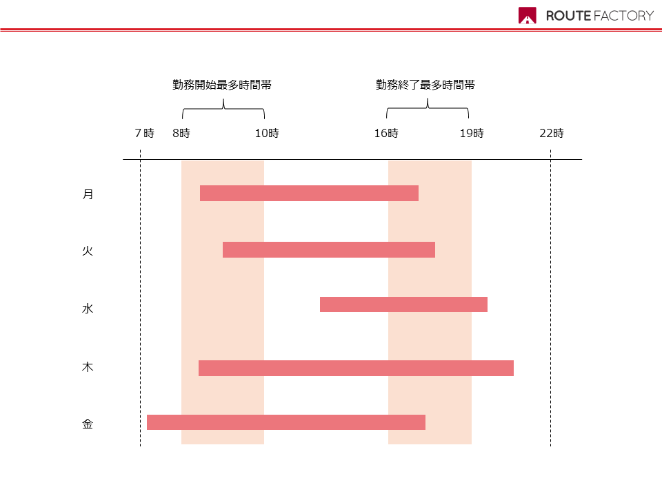 では、実態の話に入っていきますが、皆の勤怠データを参照すると、8時台や9時台に仕事を開始している人が多く、時には朝早めの7時台からとか、少し後ろにズラした10時台やお昼頃から勤務開始している日も見受けられます。仕事を終える時間帯ですが、16時台から19時台が多く、日によっては20時~22時の間という時間帯も見受けられます。