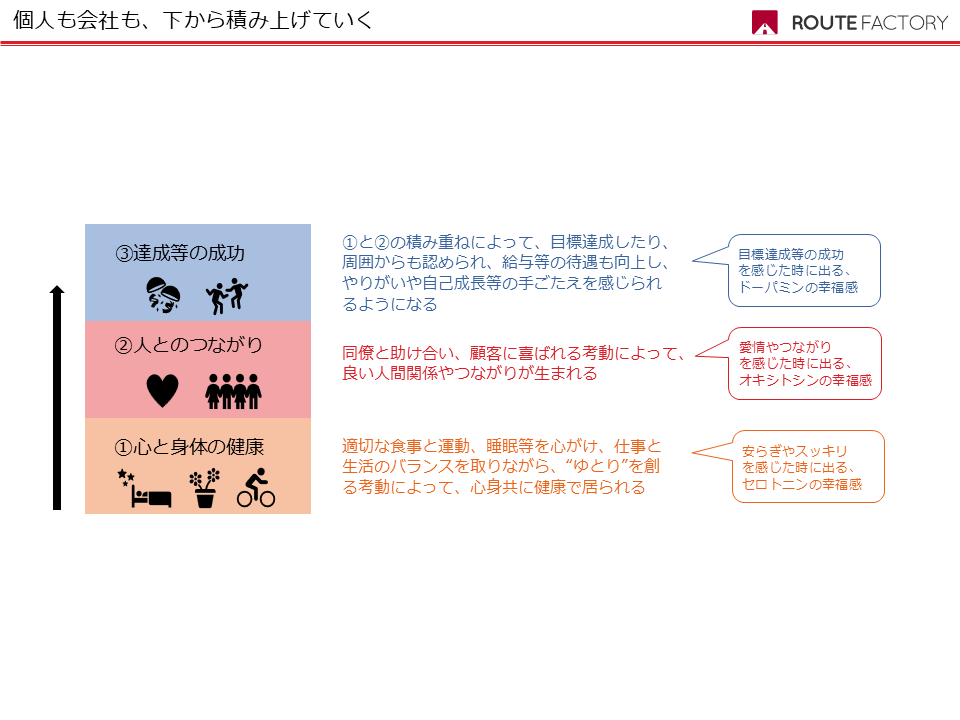 これらの両方に共通する内容なのですが、“イキイキ・ワクワクと幸せを感じながら”仕事もプライベートも充実させる順番があるようなのです。それは、この図にあるような①から③の順番で積み上げていけば良いのだそうです。